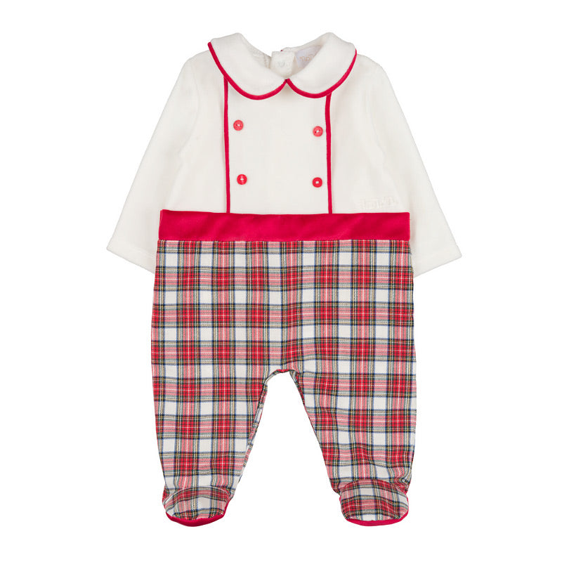 Salopeta alba cu ursulet si detalii in carouri