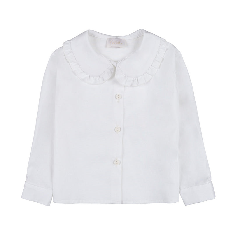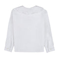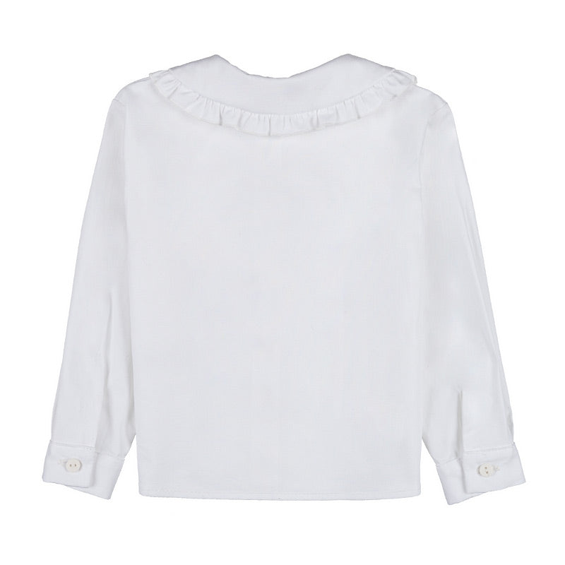 Aceasta camasa alba cu maneca lunga aduce un plus de rafinament si stil garderobei celor mici. Are un guler delicat cu detalii decorative, care adauga o nota eleganta si feminina. Inchiderea frontala cu nasturi o face usor de imbracat si de purtat, fiind potrivita atat pentru tinute de zi, cat si pentru ocazii speciale.