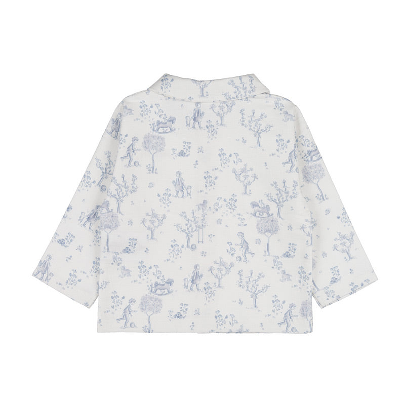 Eleganta si rafinata, aceasta camasa bleu cu maneca lunga este realizata din bumbac 100% si decorata cu un imprimeu toile de Jouy in nuante albastre. Gulerul rotund si inchiderea frontala cu nasturi completeaza designul clasic, facand-o ideala pentru evenimente, ceremonii sau ocazii speciale.
