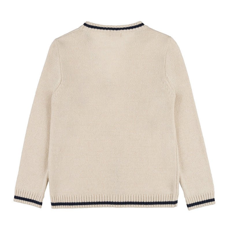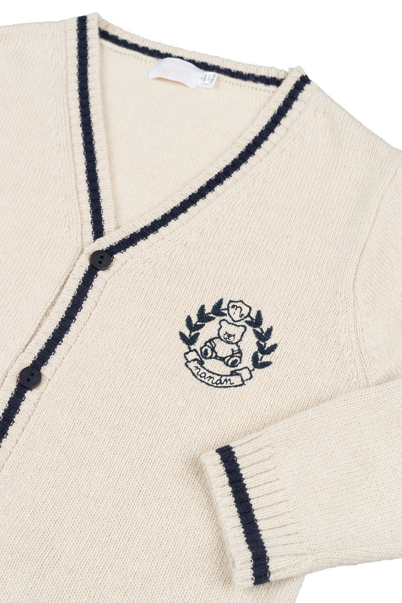 Acest cardigan bej imbina eleganta cu functionalitatea, fiind ideal pentru tinutele de zi ale copiilor. Decorat cu o broderie rafinata ce ilustreaza iconicul ursulet Nanan, incadrat de frunze de laur, simbol al delicatetii si rafinamentului, cardiganul adauga un plus de stil garderobei. Modelul cu margini contrastante si croiala clasica este usor de asortat si ofera confort pe tot parcursul zilei.