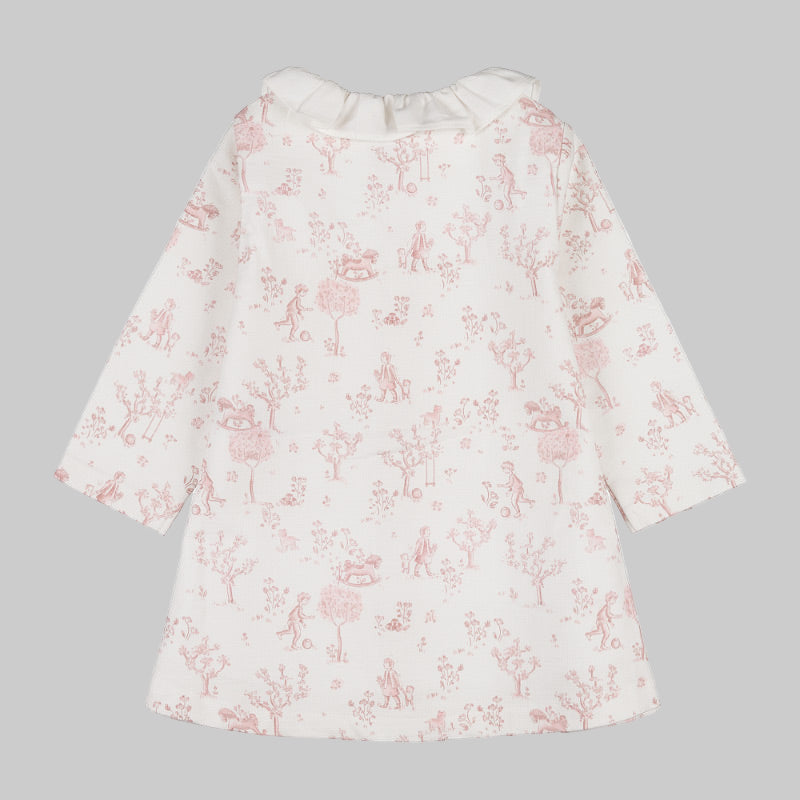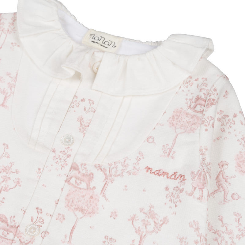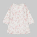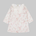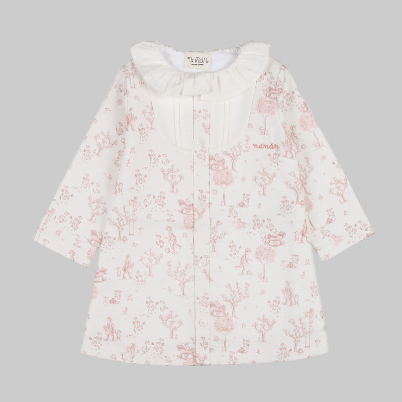Aceasta rochie roz este realizata din bumbac organic 100% si este decorata cu un imprimeu allover delicat, perfect pentru ocazii speciale. Gulerul alb incretit adauga un aer elegant si feminin, in timp ce deschiderea frontala cu nasturi perlati ofera practicitate si rafinament. Un model versatil, ideal pentru evenimente sau tinute de zi cu zi, ce imbina confortul cu eleganta.