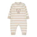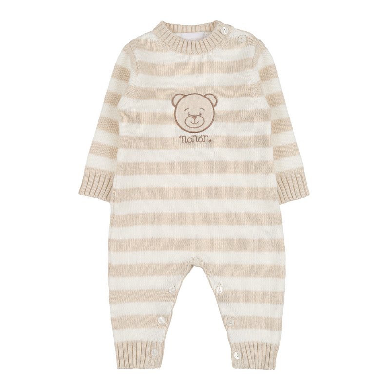 ✔️ Design adorabil: Model în dungi bej și crem, cu broderie drăgălașă de ursuleț și logo „Nanán” în față.