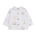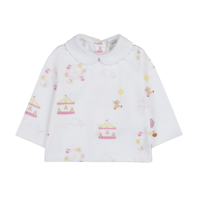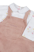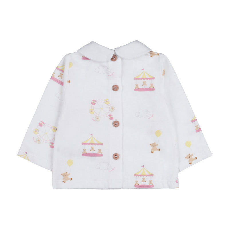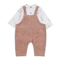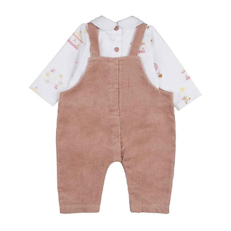 Acest set adorabil este compus dintr-o salopeta roz din catifea moale si o bluza alba cu imprimeu circus. O combinatie practica si eleganta, ideala pentru primele iesiri, tinute de zi sau ca un cadou special. Materialul din bumbac organic asigura confort si libertate de miscare pentru cei mici.